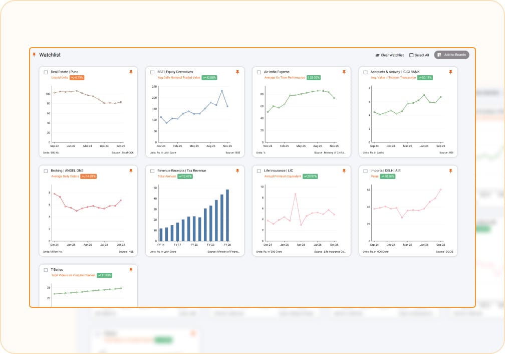 Access India’s richest repository of alternative data visualisations. Deploy instant insights and analytical power through pre-built dashboards